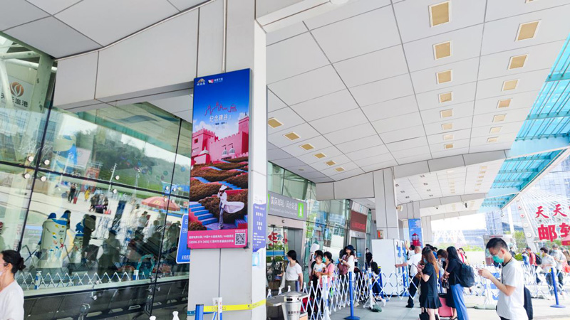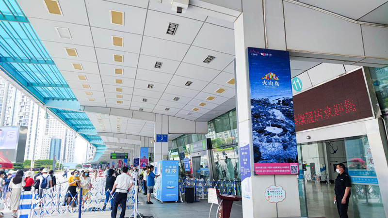 24面大幅燈箱廣告在郵輪中心出發(fā)層的廊道面向全國各地游客進(jìn)行多角度多方位的展示,通過不同的火山島的廣告畫面——藍(lán)綠色的大海、金色細(xì)軟的沙灘、暗黑色的礁石、臨海而立的粉色城堡、半球形的可愛童趣泡泡屋。讓全國游客可以領(lǐng)略火山島的獨特的濱海火山風(fēng)景線。