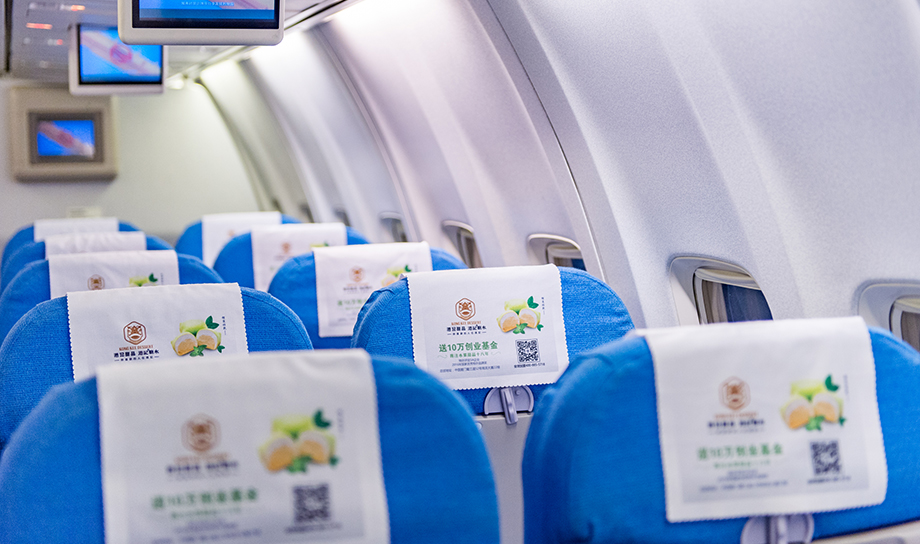 一進入機艙,每個座椅上醒目統(tǒng)一的頭片廣告,全艙集中呈現(xiàn),營造出一種沖擊力極強的視覺